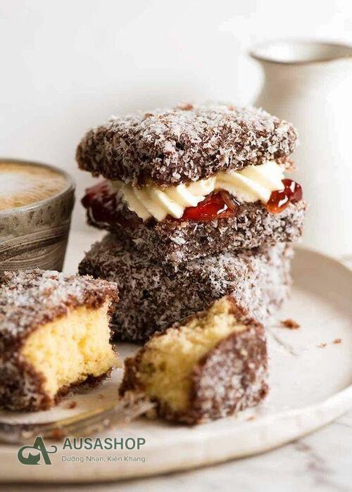 Bánh Lamington – Món bánh đặc sản nước Úc với lớp bánh bông lan mềm nhẹ, phủ bên ngoài bằng socola mượt mà rồi lăn qua dừa sấy thơm béo. Sự kết hợp giữa vị ngọt dịu của bánh, vị socola đậm đà và hương dừa béo thơm tạo nên trải nghiệm vừa lạ vừa cuốn hút. Khi cắn vào, lớp bánh mềm bên trong hòa cùng lớp phủ đậm vị bên ngoài, mang đến cảm giác hài hòa và vô cùng dễ ăn. Rất thích hợp cho tiệc trà, bánh ngọt hằng ngày hoặc làm quà tặng.